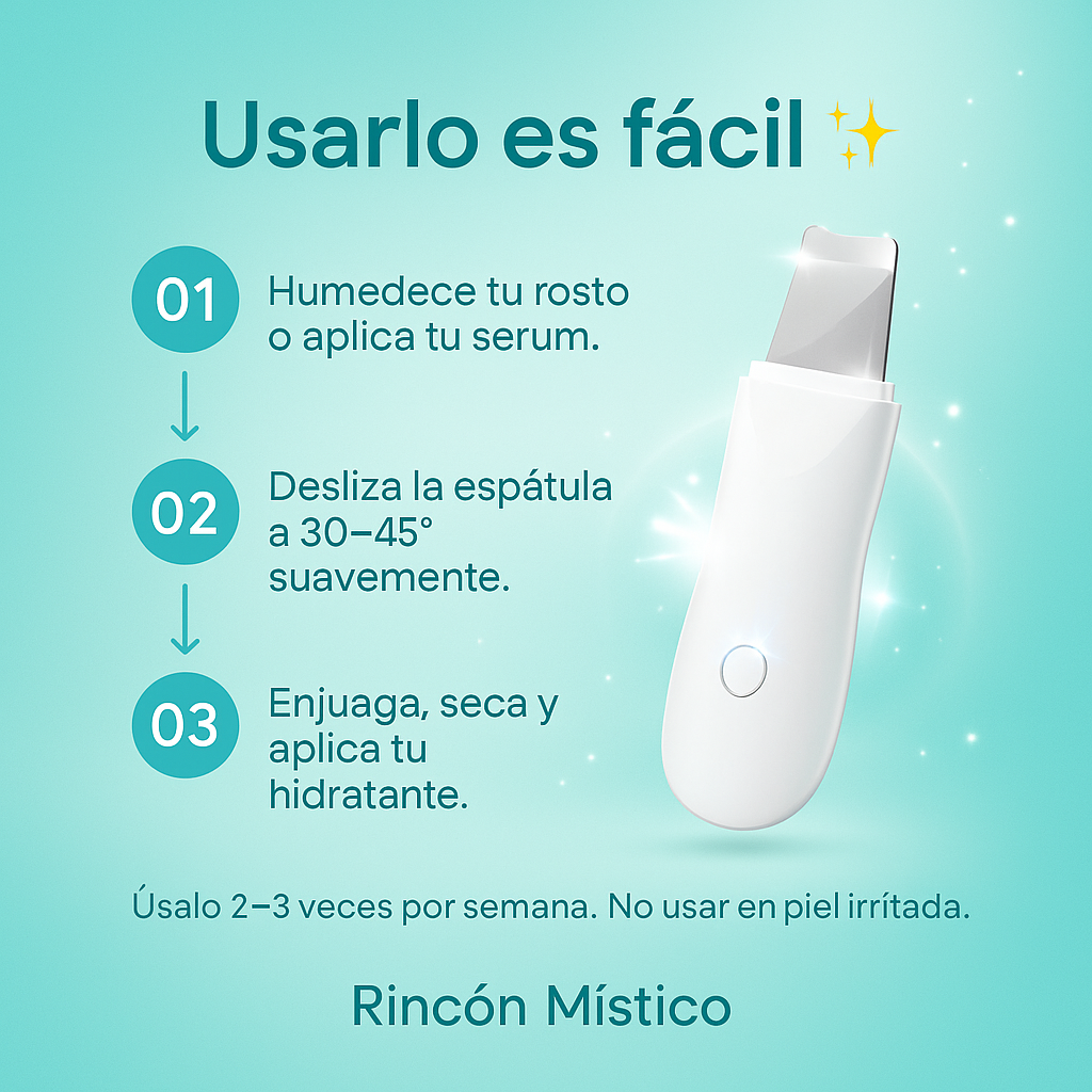Humedece tu piel o aplica serum, desliza la espátula a 30–45° y finaliza con tu hidratante. Úsalo 2–3 veces por semana para una limpieza profesional en casa, sin irritación y con efecto piel lisa y luminosa.