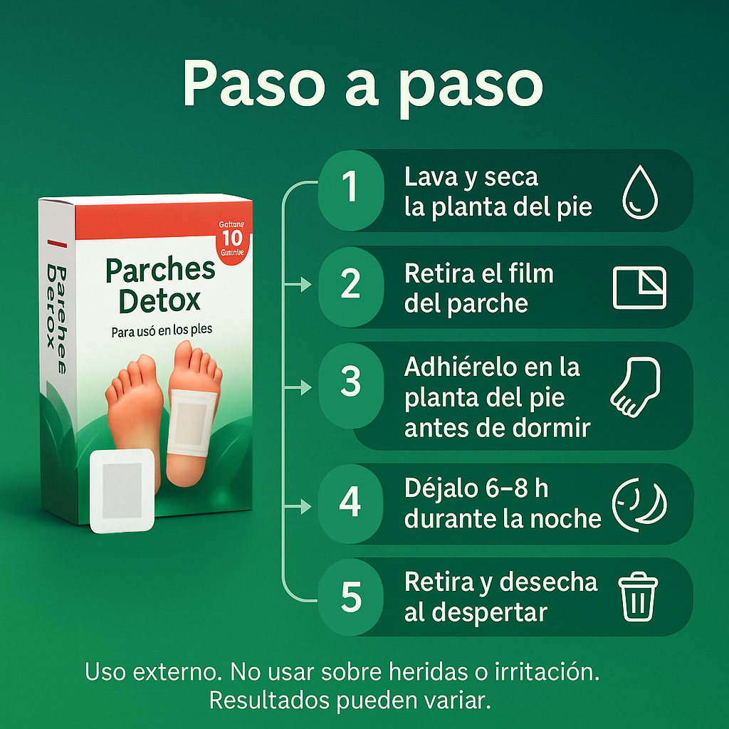 Los parches Desintoxicamente ayudan a liberar toxinas a través de la piel de los pies durante la noche (6 a 8 horas). Su efecto relajante favorece el descanso y una sensación de ligereza al despertar.